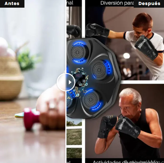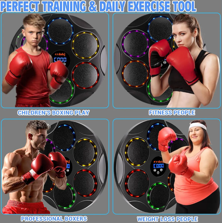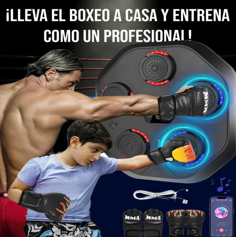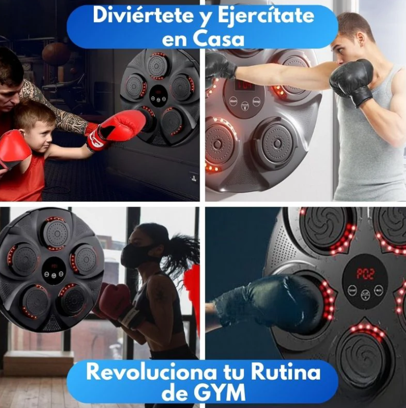 Se trata de una máquina de boxeo compacta, pensada para entrenamiento en casa — montaje en pared — que combina ejercicios de boxeo con estimulación visual, funciones inteligentes y música.